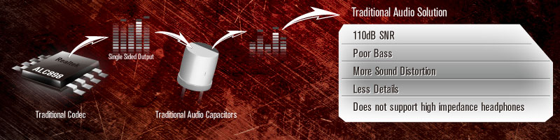 Unlike traditional onboard audio solutions that use single sided output and capacitors, Purity Sound uses a differential codec for differential output, and the signals go through a differential amplifier TI NE5532 with Direct Drive technology, thus providing Purity Sound!