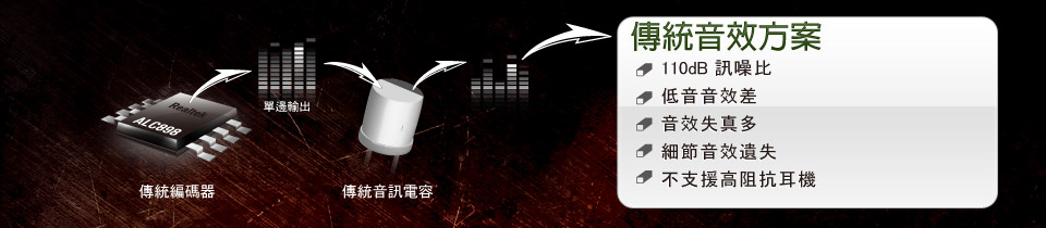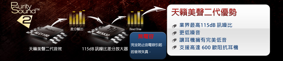 天籟美聲再進化!華擎科技大手筆採用 Nichicon Fine Gold 系列專業音效電容,保證滿足最挑剔的音響發燒友。Realtek ALC1150 音源晶片支援 7.1 聲道高保真 HD 音效,差分放大器支援 115dB 訊噪比數模轉換器,TI® NE5532 優質耳放支援高達 600ohm 阻抗耳機,加上無電容 Direct Drive 技術、EMI 防護蓋和 PCB 隔離板,並支援 DTS Connect,天籟美聲二代提供您更純淨自然的超優質音效饗宴。 |