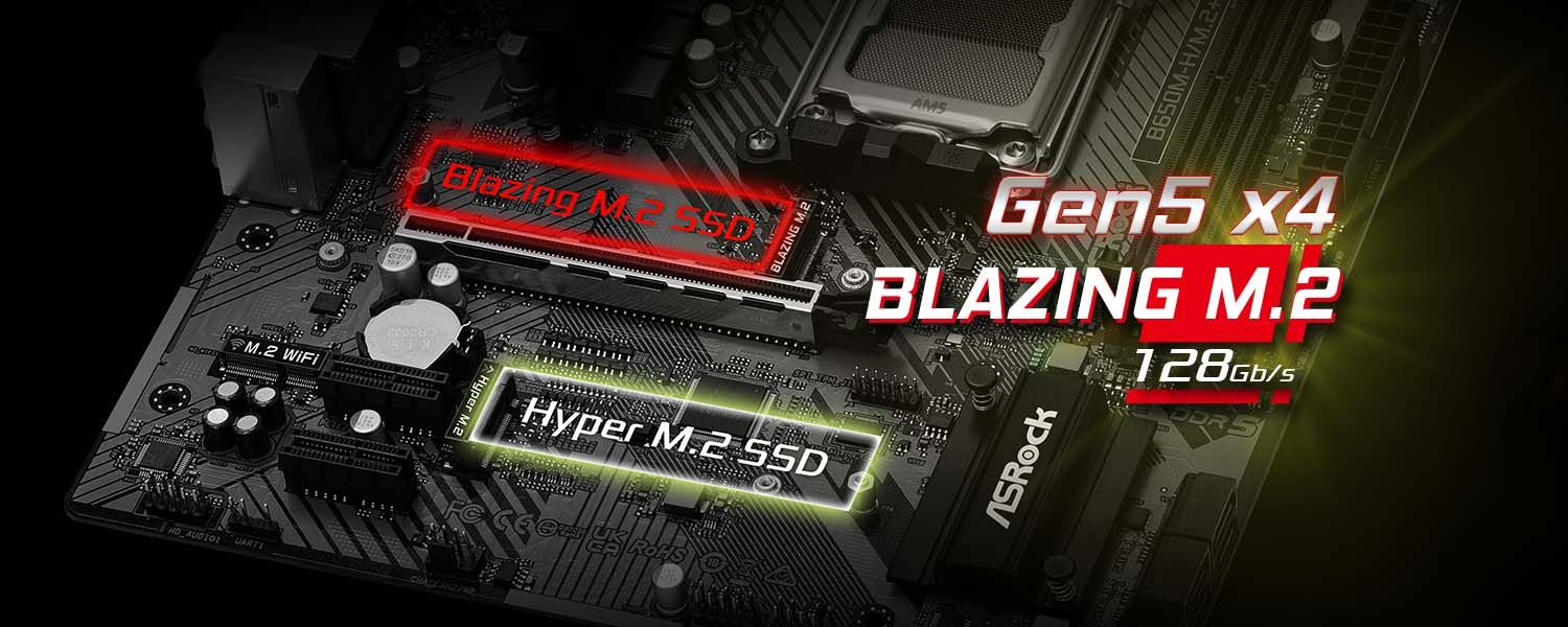 • 4 SATA3, 1 Blazing M.2 (PCIe Gen5x4), 1 Hyper M.2 (PCIe Gen4x4)