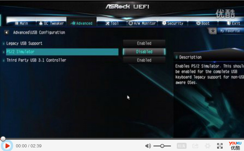 通过此举使板载 USB 接口具备 PS/2 接口功能,您即可通过 USB 接口安装 Windows 7 操作系统。安装完成后请将 PS/2 Simulator 项目恢复为关闭状态。