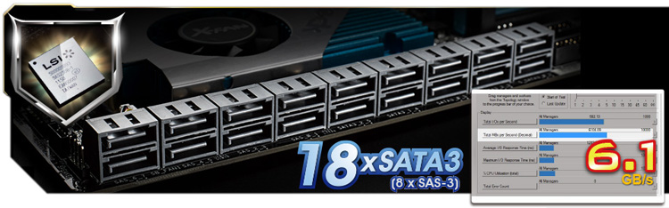 Một điều mà bạn không thể bỏ lỡ trên bo mạch chủ khổng lồ này là các cổng kết nối lưu trữ! ASRock x99 Extreme11 tự hào có tổng cộng 18 cổng SATA3 ở mặt bên của bo mạch chủ, trong đó có 10 cổng SATA3 6.0 Gb/s của Intel® X99 và bổ sung thêm 8 cổng SAS-3 12.0 Gb/s cung cấp bởi chip LSI SAS 3008. Các thí nghiệm tại phòng thử nghiệm của ASRock cho thấy tốc độ truyền tải dữ liệu có thể đạt đến mức kinh ngạc 6.1 GB/s khi ổ SSD được kết nối với các cổng lưu trữ!