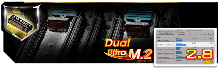 Nếu bạn nghĩ rằng các lựa chọn lưu trữ cho các bo mạch chủ X99 mạnh nhất trên thế giới chỉ là như vậy thì hẳn bạn đang sai lầm. Bo mạch chủ này còn có thêm hai khe Ultra M.2 PCIe Gen3 x4 nhanh nhất thế giới có thể đạt tốc độ 2.8 GB /s với ổ SSD cũng được đặt giữa các khe PCIe.