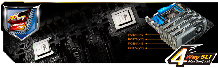 Sở hữu đủ các khe cắm PCIe để tạo nên 4-way SLI hoặc CrossFireX là điều hợp lý và cơ bản cho bất kỳ kiến trúc cao cấp nào. Tuy nhiên điều đó vẫn không đủ đối với bo mạch chủ này. ASRock X99 Extreme11 có 5 khe PCIe x16 Gen3 cộng với các chip nối hai cực PLX PEX 8747 hỗ trợ cho chức năng 4-way SLI hoặc CrossFireX ở chế độ x16/16/16/16 với 4 card đồ họa!